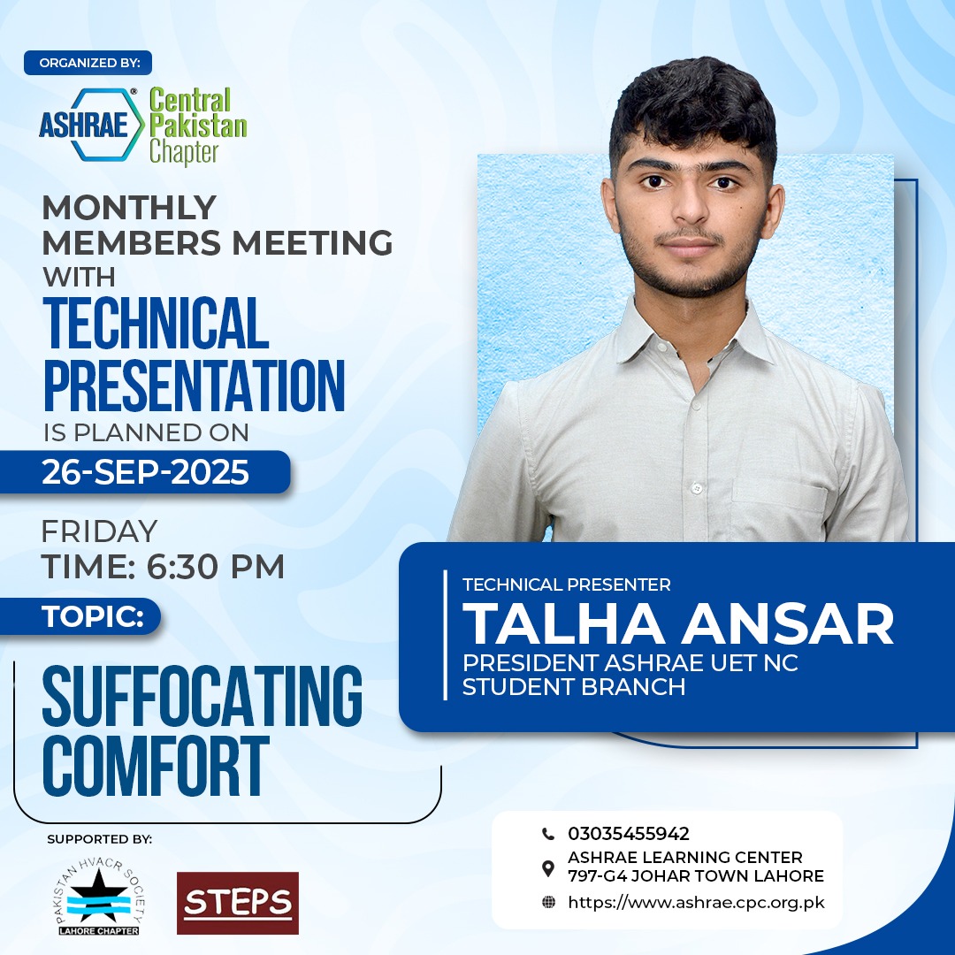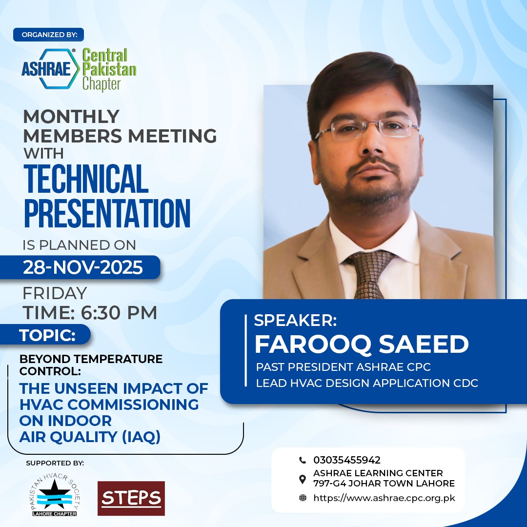 The ASHRAE Central Pakistan Chapter (CPC) with more than 150 members (Engineers, Architects, Researcher, Academia, Technicians, and Students) is one of the most active chapters in ASHRAE Region-at-Large (RAL) is committed to the achievement of technical quality and excellence in all our programs, courses and other activities.